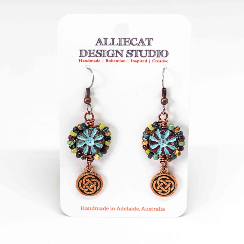 These are rustic hand crafted earrings which have Czech glass focal beads and Czech glass seed beads, teamed with copper TierraCast charms. The ear wires are Stainless Steel.