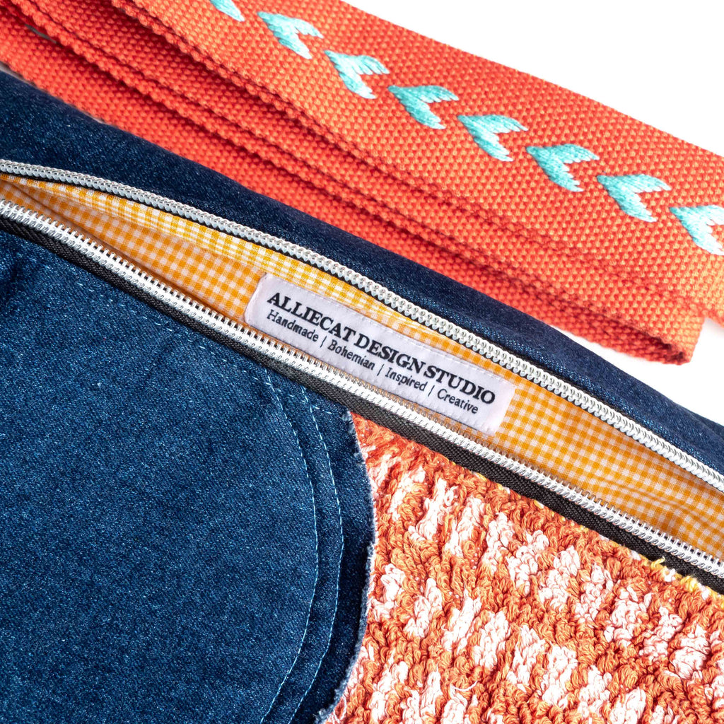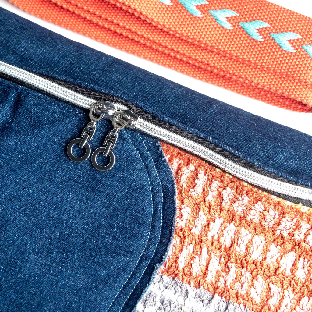 The outside of the bag features preloved towel and preloved denim from jeans with silver zippers. All the hardware is also silver.