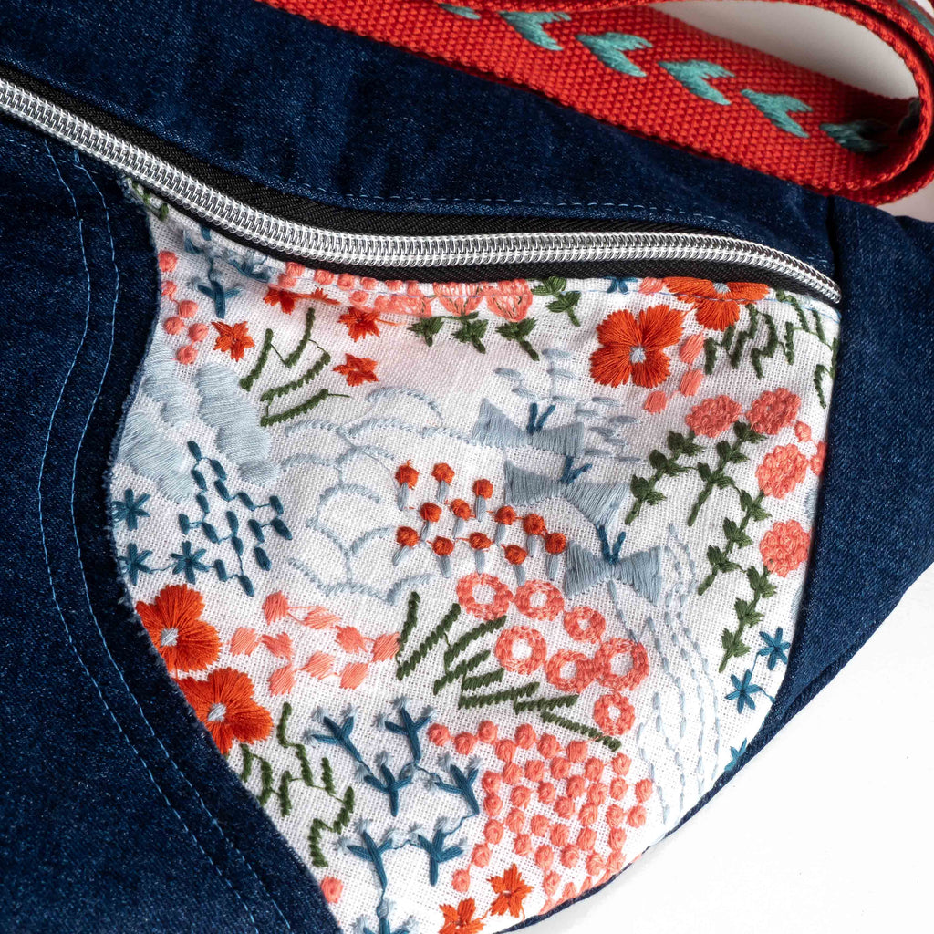 The outside of the bag features preloved japanese embroidered fabric and preloved denim from jeans with silver zippers. All the hardware is also silver.