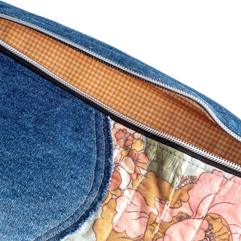 The outside of the bag features preloved pillow case and preloved denim from jeans with silver zippers. All the hardware is also silver.