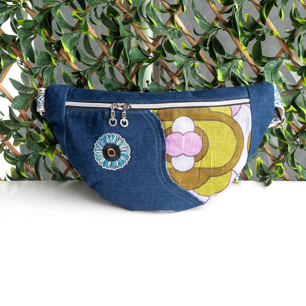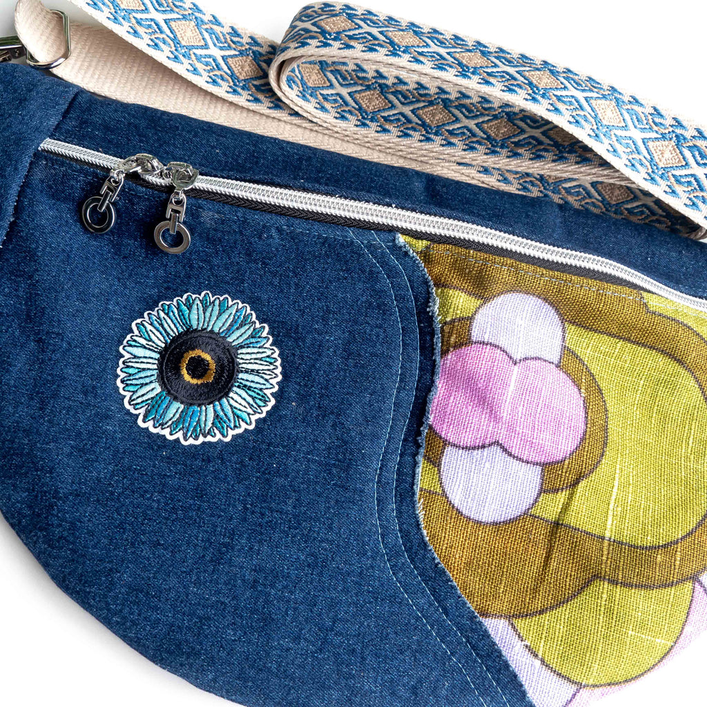 The outside of the bag features preloved placemat and preloved denim from jeans with silver zippers. All the hardware is also silver.