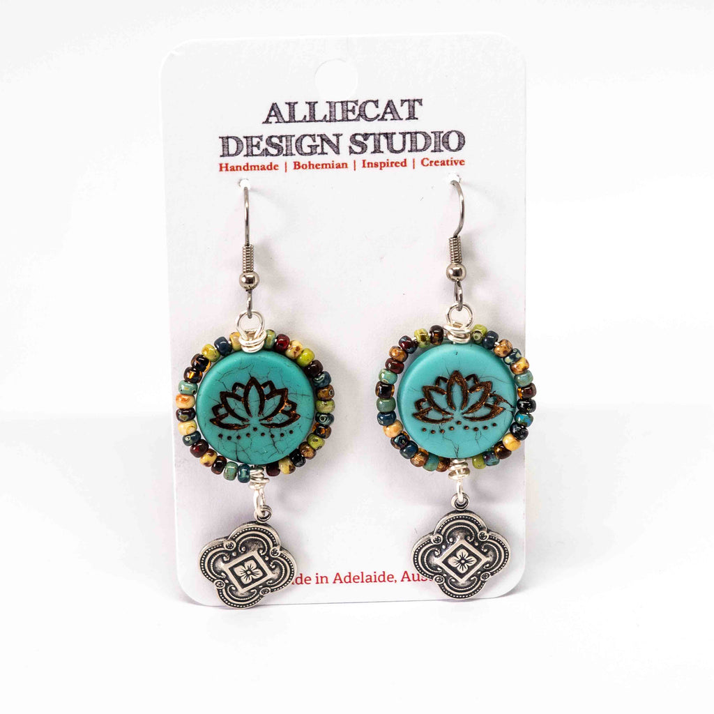 These are rustic hand crafted earrings which have Czech glass focal beads and Czech glass seed beads, teamed with silver tone charms. The ear wires are Stainless Steel.