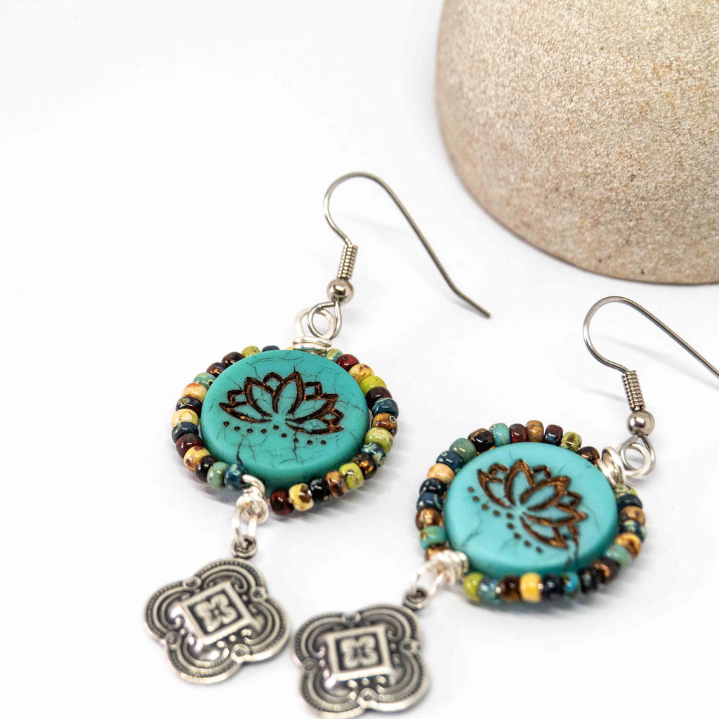 Wire Wrapped Rustic Turquoise Lotus Picasso Silver Medallion Large Earrings