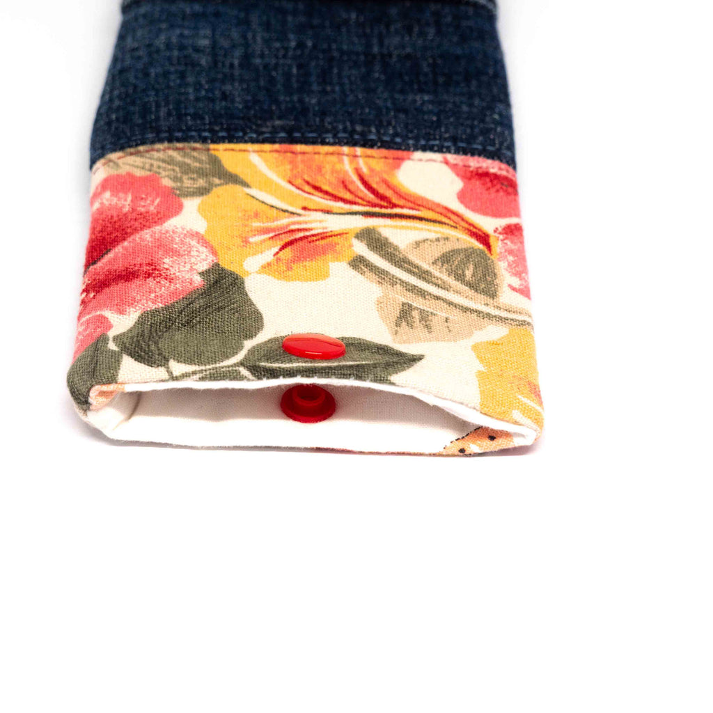 It has fabric from a preloved dress and preloved denim jeans on the outside and inside has fabric from a preloved pillowcase. It also has several layers of interfacing and is finished off with a press snap.