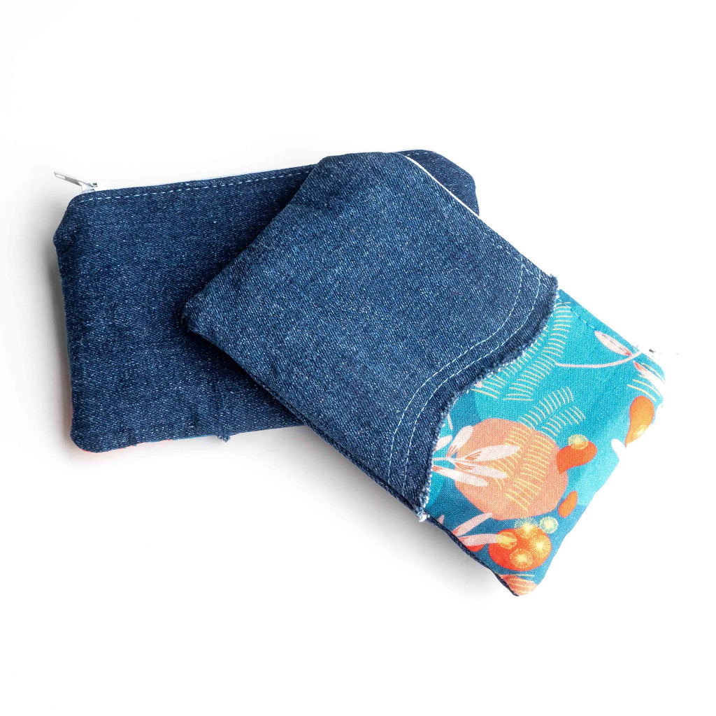 They have been made from preloved fabric and preloved denim from jeans. They are finished off with a white zip.