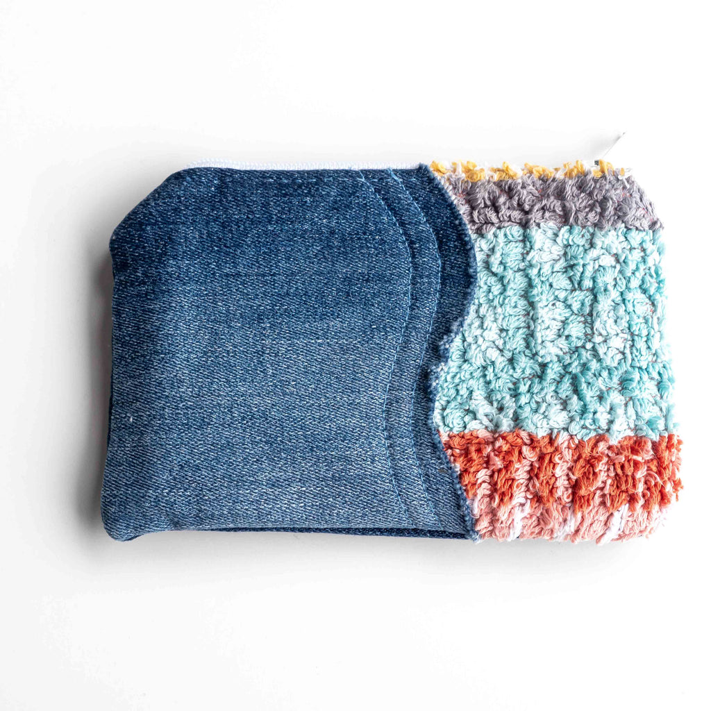 They have been made from preloved towel and preloved denim from jeans. They are finished off with a white zip.