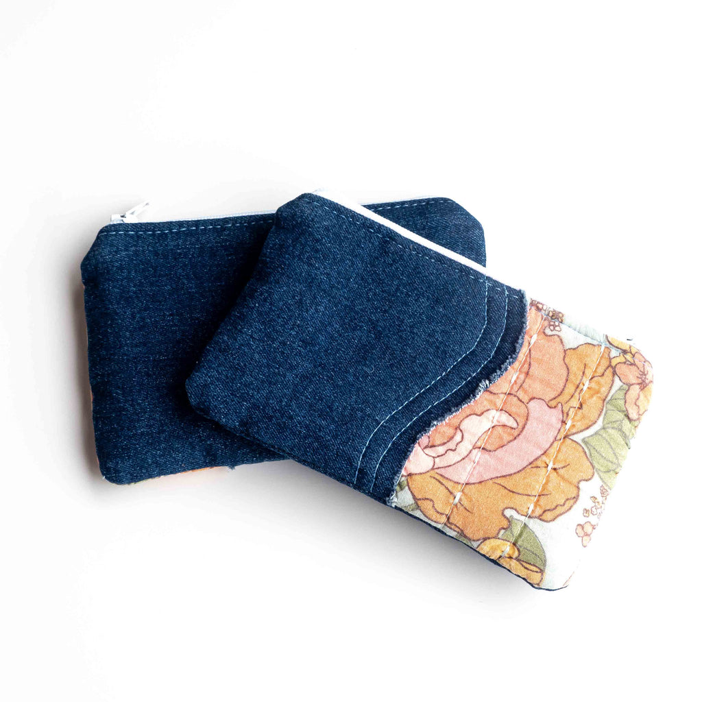 They have been made from a preloved quilted pillow case and preloved denim from jeans. They are finished off with a white zip.