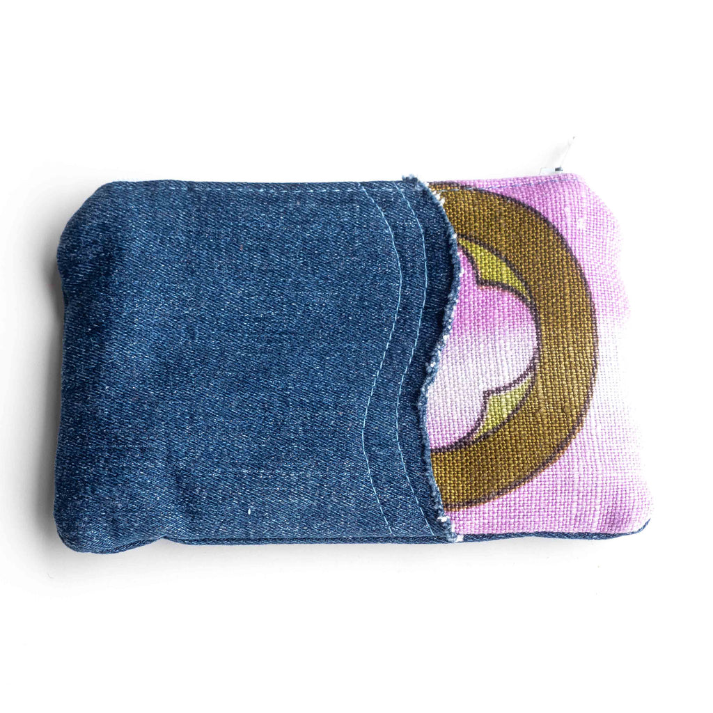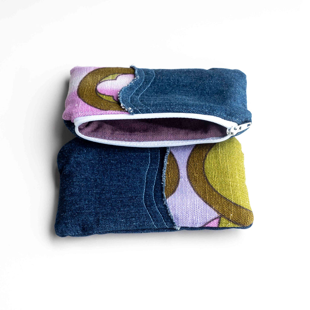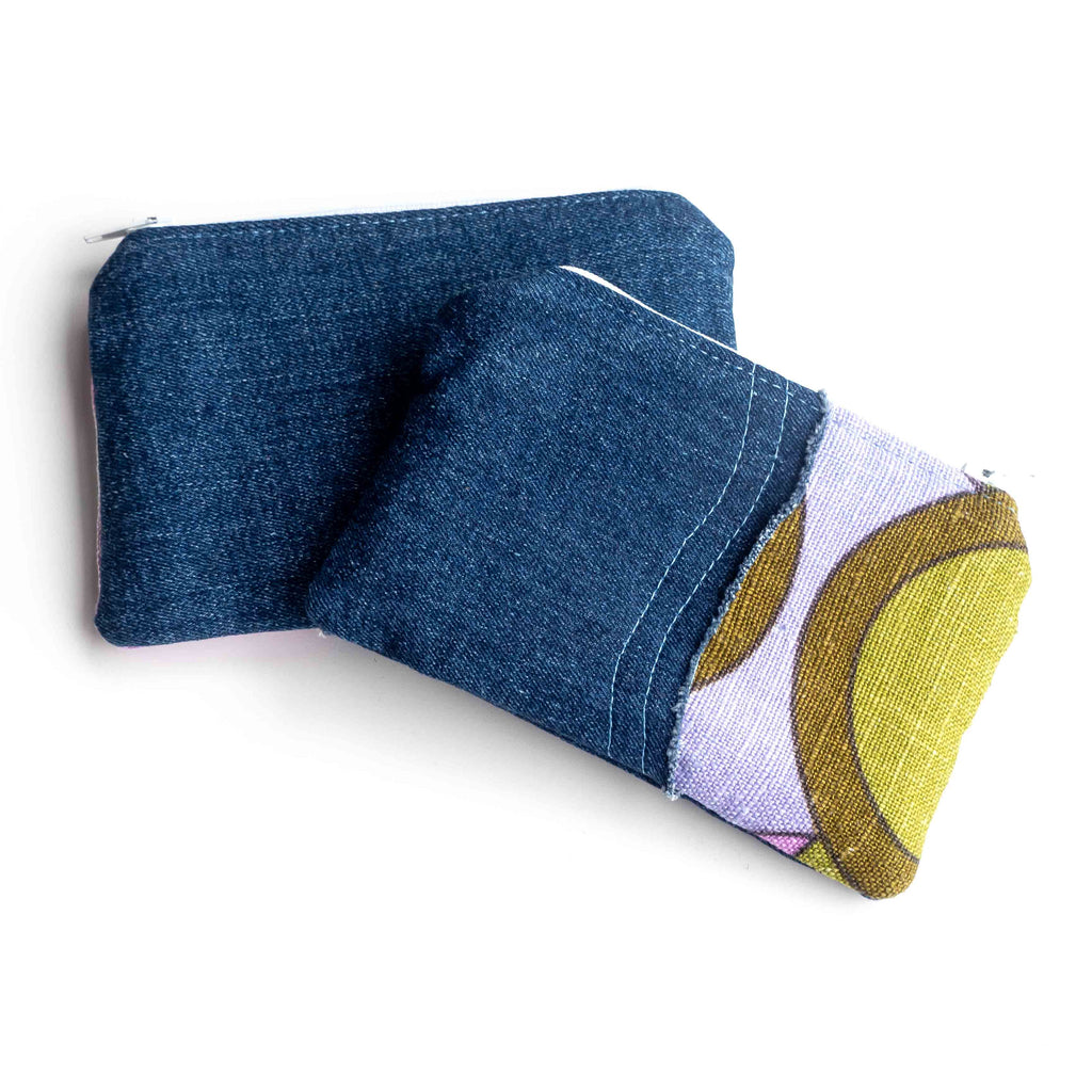 They have been made from a preloved placemat and preloved denim from jeans. They are finished off with a white zip.